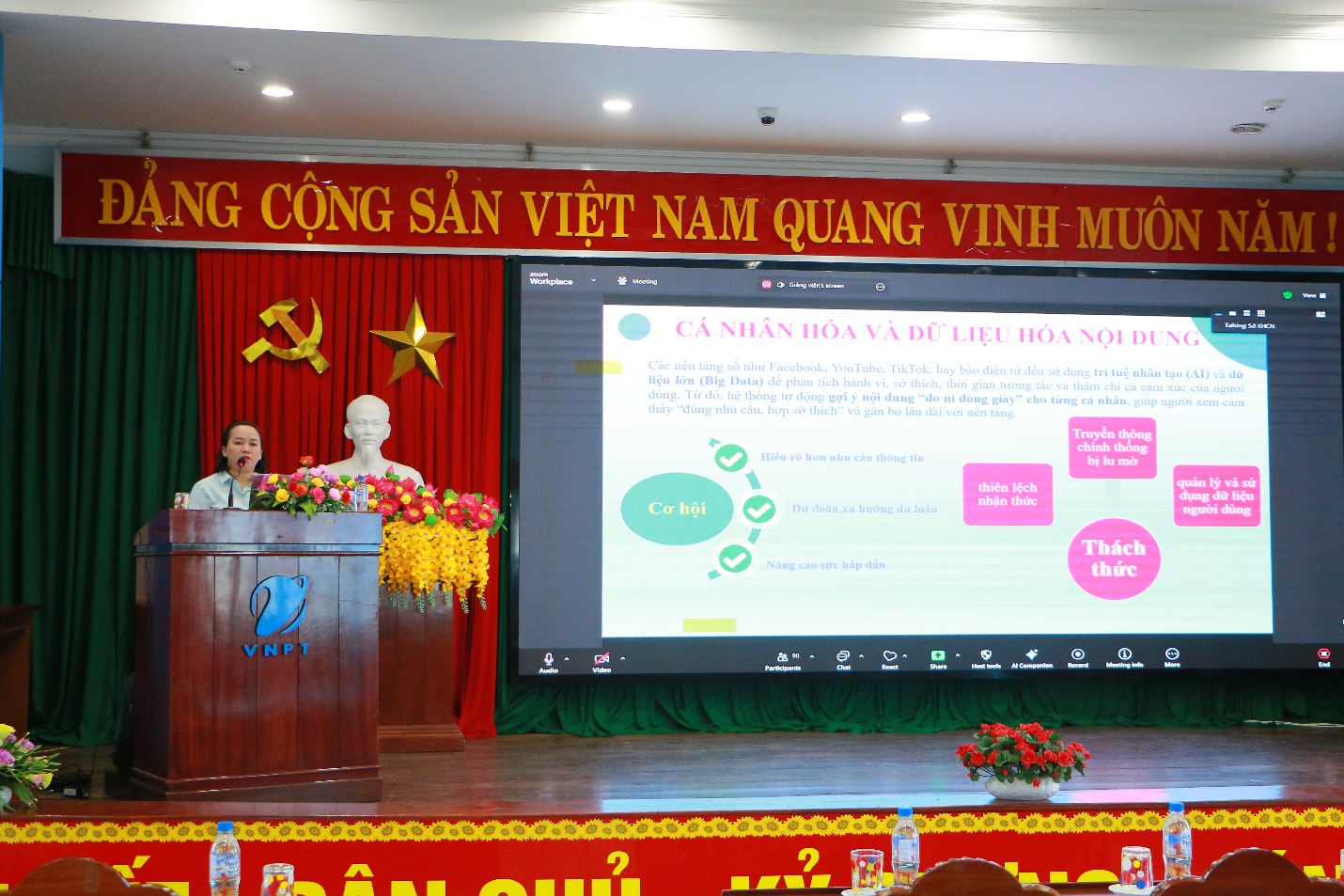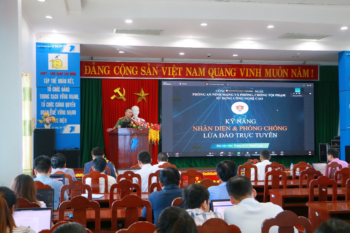 - Trung tá Lê Thành Long, Phó Trưởng phòng An ninh mạng và phòng, chống tội phạm sử dụng công nghệ cao Công an tỉnh, trình bày nội dung về nhận diện và phòng ngừa các thủ đoạn lừa đảo trực tuyến; cách bảo vệ dữ liệu cá nhân trong môi trường số.