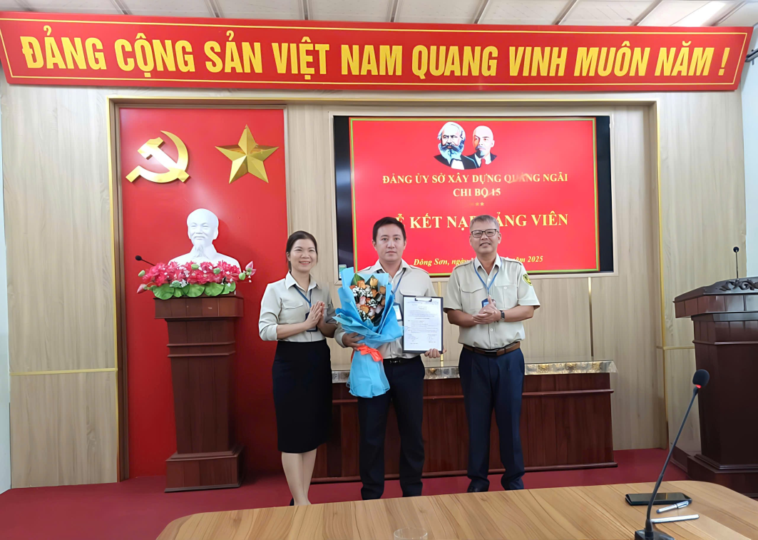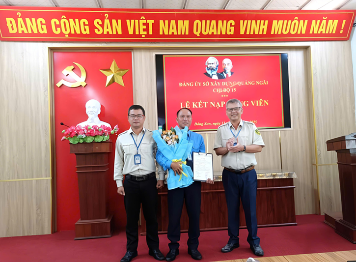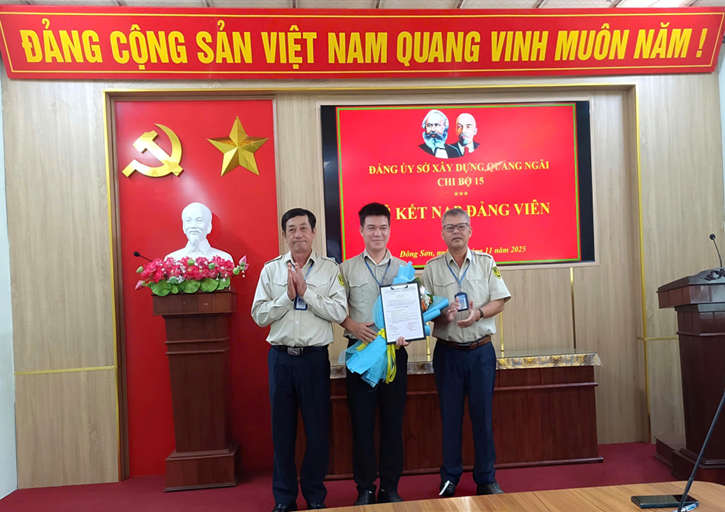 Thực hiện các Quyết định số 166-QĐ/ĐU, 167-QĐ/ĐU và 168-QĐ/ĐU ngày 25/10/2025 của Đảng ủy Ủy ban nhân dân tỉnh Quảng Ngãi về việc kết nạp đảng viên, sáng ngày 11/11/2025, Chi bộ 15 trực thuộc Đảng ủy Sở Xây dựng đã long trọng tổ chức Lễ kết nạp đảng viên mới cho 03 quần chúng ưu tú: Đồng chí Nguyễn Chí Thiết, đồng chí Phan Văn Hùng (nhân viên phòng Quản lý và khai thác Lý Sơn) và đồng chí Tạ Ngọc Huy (nhân viên Phòng Quản lý và khai thác Sa Kỳ).