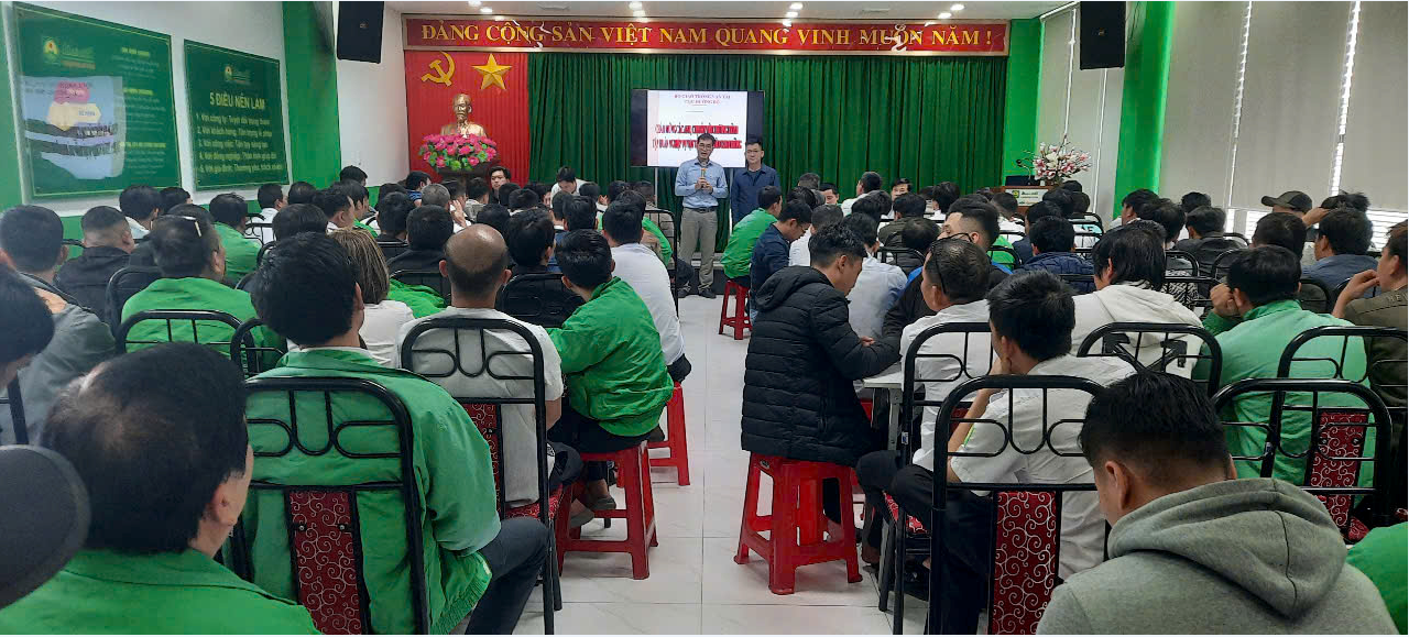 (Công chức Phòng QLVT&PTNL, Sở Xây dựng tuyên truyền đến lái xe, nhân viên phục vụ về đấu tranh chống buôn lậu, gian lận thương mại, hàng giả tại buổi tập huấn nghiệp vụ lái xe do Hiệp Hội vận tải ô tô tỉnh Quảng Ngãi tổ chức)