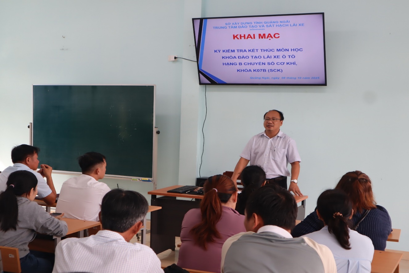Sáng ngày 08/10/2025, Trung tâm đào tạo và sát hạch lái xe tỉnh Quảng Ngãi đã tổ chức lễ khai mạc kỳ kiểm tra kết thúc môn học dành cho học viên khóa đào tạo lái xe ô tô hạng B chuyển số cơ khí, khóa K07B (SCK). Hoạt động này được thực hiện theo Quyết định số 208/QĐ-TTĐT&SHLX ngày 07/10/2025 của Giám đốc Trung tâm, nhằm đánh giá kết quả học tập toàn diện của học viên sau quá trình đào tạo.